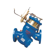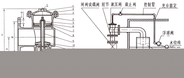 H142X液壓水位控制閥是一種自動控制水箱、水塔液面高度的水力控制閥。當(dāng)水面下降超過預(yù)設(shè)值時,浮球閥打開,活塞上腔室壓力降低,活塞上下形成壓差,在此壓差作用下閥瓣打開進(jìn)行供水作業(yè);當(dāng)水位上升到預(yù)設(shè)高度時,浮球閥關(guān)閉,活塞上腔室壓力不斷增大致使閥瓣關(guān)閉停止供水。如此往復(fù)自動控制液面在設(shè)定高度,實(shí)現(xiàn)自動供水功能。