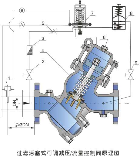YQ98012型過(guò)濾活塞式可調(diào)減壓/流量控制閥是一種穩(wěn)定閥后壓力同時(shí)控制流量不大于設(shè)定量大值的目控閥門(mén),這種穩(wěn)定不受閥前供水系統(tǒng)流量及壓力變化的影響。然而當(dāng)閥前流量小于設(shè)定值時(shí),主閥全開(kāi),不會(huì)增加流量。由畢托管傳遞壓差信號(hào)給限流導(dǎo)閥,限流導(dǎo)閥和針閥執(zhí)行兩路控制,通過(guò)限流導(dǎo)閥調(diào)節(jié)摞栓的調(diào)節(jié),使閥后流量達(dá)到設(shè)定值。通過(guò)減壓導(dǎo)閥調(diào)節(jié)摞栓的調(diào)節(jié),來(lái)控制主閥上游壓力;活塞下腔有節(jié)流孔與下游相通,可綬沖閥門(mén)的關(guān)閉。主閥兩端壓力差是閥門(mén)啟,閉的驅(qū)動(dòng)能源。主要用于給、排水、消防、空調(diào)和各類(lèi)工礦企業(yè)等供水管網(wǎng)中需要過(guò)濾又要穩(wěn)定閥后壓力并對(duì)流量實(shí)現(xiàn)控制的場(chǎng)所和工況。