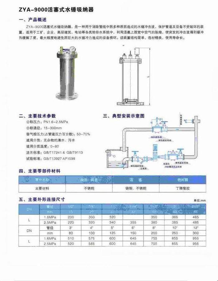 ZYA-9000活塞式水錘吸納器(水錘消除器)是一種用于消除管線中因多種原因造成的水錘沖擊波,保護管道及設(shè)備不受破壞的裝置。水錘消除器適用于工礦、企業(yè)、高層建筑、電站等各類給排水系統(tǒng)中,利用活塞上腔室中空氣的脹縮,使突發(fā)的沖擊波得到緩沖而緩解了度,最大程度地避免因巨大的水錘沖力造成的設(shè)備損壞。該裝置結(jié)構(gòu)簡單、選材精良、使用壽命長。