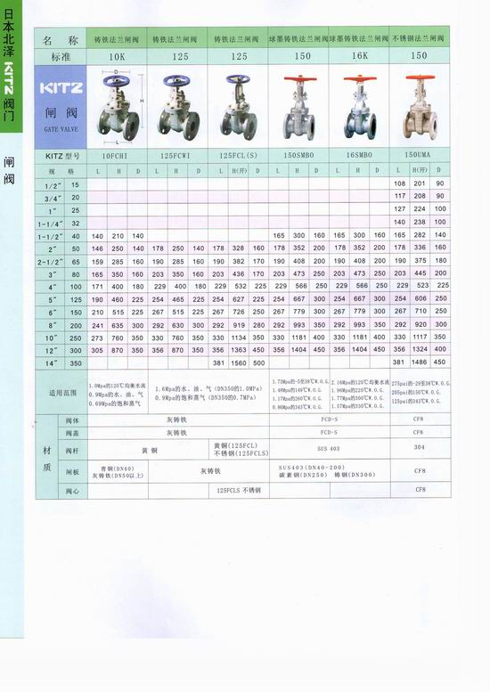 日本北澤KITZ鑄鐵法蘭閘閥:閘閥的啟閉件是閘板,閘板的運(yùn)動(dòng)方向與流體方向相垂直,閘閥只能作全開和全關(guān) , 不能作調(diào)節(jié)和節(jié)流。閘板有兩個(gè)密封面 , 常用的模式閘板閥的兩個(gè)密封面形成楔形、楔形角隨閥門參數(shù)而異 , 通常為 50, 介質(zhì)溫度不高時(shí)為 2°52' 。