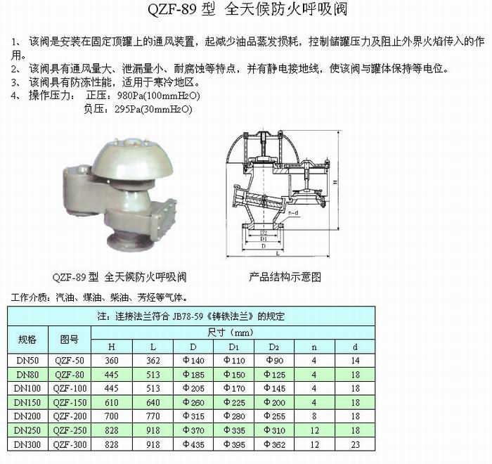 QZF-89型全天候阻火呼吸閥是安裝在固定頂罐上的通風(fēng)裝置,起減少油品蒸發(fā)損耗,控制儲罐壓力及阻止外界火焰?zhèn)魅氲淖饔谩?該閥具有通風(fēng)量大,泄漏量小,耐腐蝕等特點,并有靜電接地線,使該閥與罐體保持等電位。該閥具有防凍性能,適用于寒冷地區(qū)。 QZF-89全天候阻火呼吸閥性能及特點: