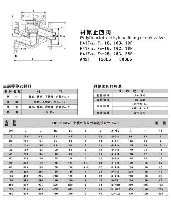 升降式襯氟止回閥是一種依靠介質(zhì)本身的流動(dòng)而自動(dòng)啟閉閥瓣用來阻止介質(zhì)逆向流動(dòng)的自動(dòng)閥門,襯里止回閥基本類型有四種:H41型法蘭連接直通升降式止回閥和H42型升降立式止回閥、H44立式止回閥、H76旋啟式止回閥。襯氟止回閥內(nèi)襯聚四氟乙烯,將介質(zhì)與閥體完全隔離開,避免腐蝕性的介質(zhì)對(duì)閥體侵蝕。適用場(chǎng)合各種濃度的王水、硫酸、鹽酸、氫氟酸和各種有機(jī)酸、強(qiáng)酸、強(qiáng)氧化劑等。