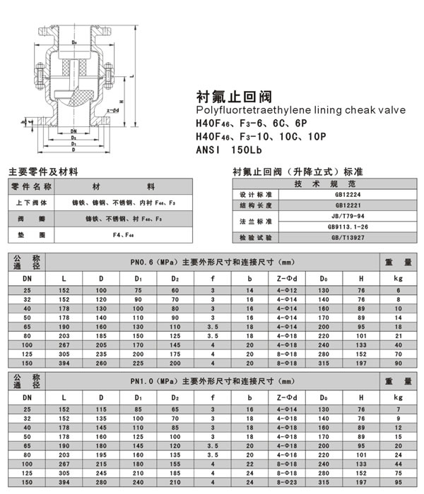 H40F46型襯氟止回閥是一種依靠介質(zhì)本身的流動(dòng)而自動(dòng)啟、閉閥瓣用來阻止介質(zhì)向逆向流動(dòng)的自動(dòng)閥門。襯里新型止回閥。FEP(F46)、PCTFE(F3)襯氟止回閥適用在-20℃~150℃的各種濃度的王水、硫酸、鹽酸、氫氟酸和各種有機(jī)酸、強(qiáng)酸、強(qiáng)氧化劑,F(xiàn)EP還適用于各種濃度的強(qiáng)堿有機(jī)溶劑以及其它腐蝕性氣體、液體介質(zhì)的管路上使用。 閥。 |