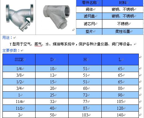用途及特點(diǎn) Y型過(guò)濾器是輸送介質(zhì)的管道系統(tǒng)不可缺少的一種裝置,通常安裝在水力控制閥或其它設(shè)備的進(jìn)口端,用來(lái)清除介質(zhì)中顆粒性雜質(zhì),以保護(hù)閥門設(shè)備的正常使用。Y型過(guò)濾器的過(guò)濾網(wǎng)采用不銹鋼雙層網(wǎng)結(jié)構(gòu),堅(jiān)固耐用,具有結(jié)構(gòu)先進(jìn)、流阻小、排污方便等特點(diǎn),可用于水、蒸氣、油品、硝酸、尿素、氧化性介質(zhì)等多種介質(zhì)?筛鶕(jù)用戶需要設(shè)置過(guò)濾網(wǎng)的目數(shù),一般通水網(wǎng)為18-30目,通氣網(wǎng)為40-100目,通油網(wǎng)為100-480目。連接形式法蘭式
